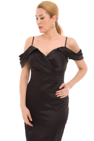 Poartă cu încredere rochia din satin negru. Elegantă și sofisticată, perfectă pentru evenimente speciale.