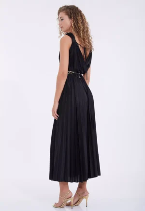 O alegere ideală pentru evenimente: rochia elegantă neagră midi fără mâneci. Rafinament și confort garantat.