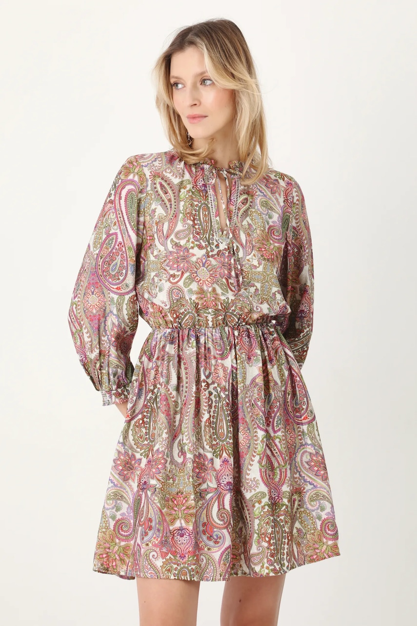 Detaliile fine, precum decolteul ascuțit cu legătură decorativă și banda elastică în talie, subliniază feminitatea, creând o siluetă atrăgătoare. Tesătura ornamentată cu model Paisley conferă un aspect sofisticat, perfect pentru evenimente speciale sau întâlniri de afaceri. Lungimea mini adaugă un strop de jovialitate, fiind ideală pentru zilele călduroase de primăvară sau vară.