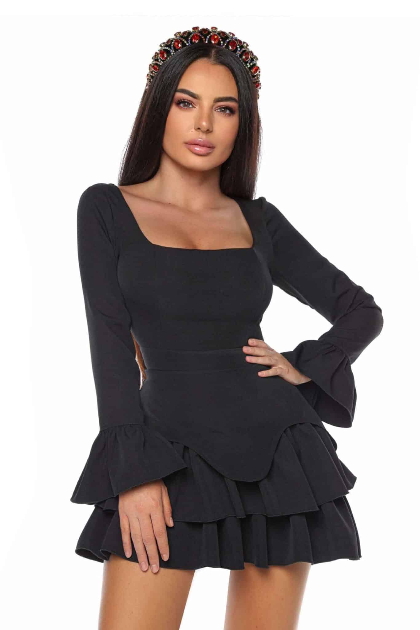 Noir Goddess este alegerea ideală pentru femeia modernă care își dorește să strălucească, indiferent de ocazie. Această rochie scurtă, decorată cu volane delicate, îmbină rafinamentul cu un aer jucăuș, perfect pentru zilele de vară sau serile de petrecere.