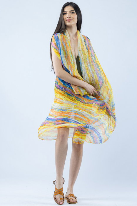 Pareo plaja din material plisat matasos si usor, imprimeu pictural galben, portocaliu si mov