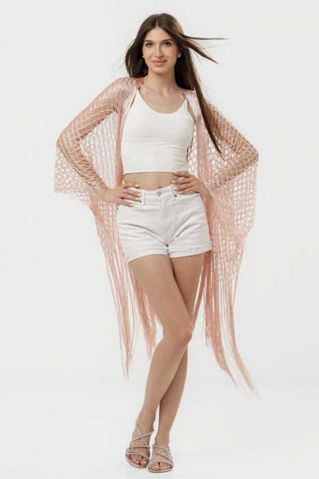 Poncho elegant roz din plasă cu fir auriu și franjuri lungi