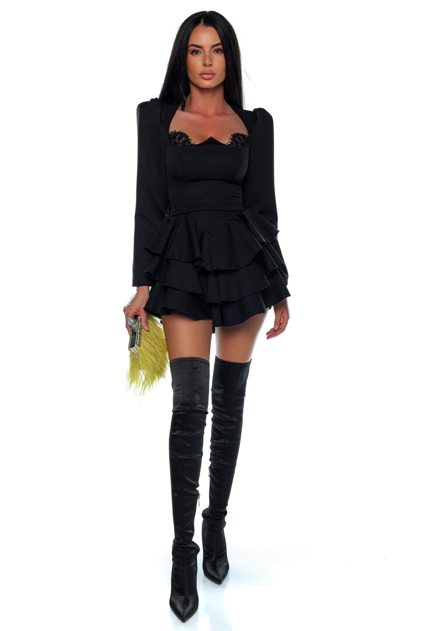 Îndrăznește să strălucești în rochia neagră cu volane. Perfectă pentru evenimente speciale. Lasă-te cucerită de eleganța sa! Comandă acum!