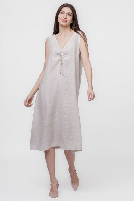 Rochie A-line din in, fara maneci, cu siret pe bust, bej