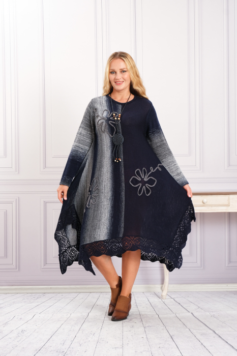 Rochie bleumarin boho chic tricotata cu baza asimetrica si model floral