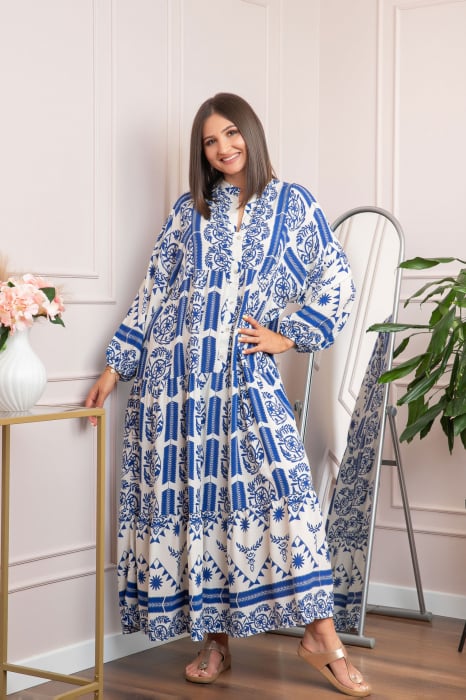 Rochie boho chic Daphne cu imprimeu albastru floral