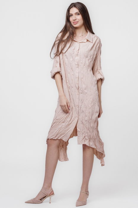 Rochia în nuanță delicată de roz aduce un suflu fresh garderobei tale. Cu un croi evazat și colțuri laterale, această rochie cămașă creponată îmbină perfect confortul și stilul.