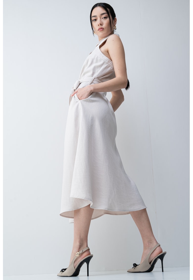 Îndrăznește să strălucești în bej. Perfectă pentru zilele călduroase, rochia-camasa casual fără mâneci îți va aduce confort și stil.