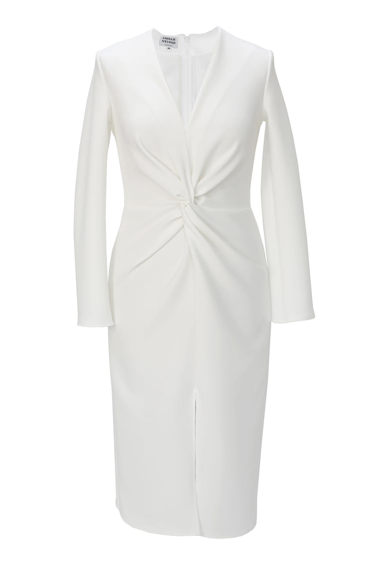 Rochie elegantă albă din sintetic cu decolteu în V și detaliu rasucit frontal – Reducere 36.43 %