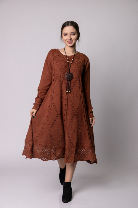 Rochie boho chic caramizie din tricot cu model romburi – Reducere 22.73 %