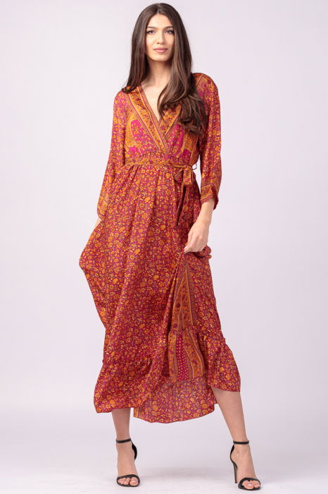 Rochie elegantă portocalie din mătase cu imprimeu oriental și volan – Reducere 24 %
