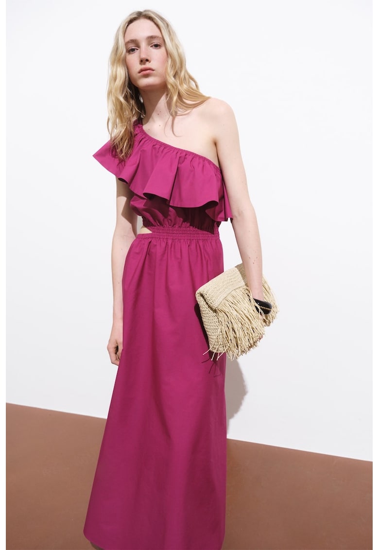 Rochia cu decolteu pe un umăr în nuanțe de roz închis este o alegere ideală pentru zilele călduroase de vară. Construită din bumbac 100%, această rochie oferă nu doar un look stylish, ci și un confort deosebit pe tot parcursul zilei.