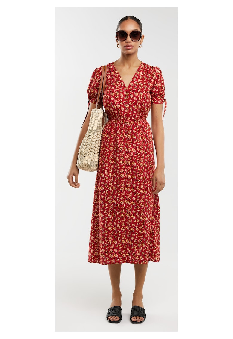 Îndrăznește să strălucești în roșu viscoză. O alegere ideală pentru seri elegante, cu imprimeu floral deosebit.