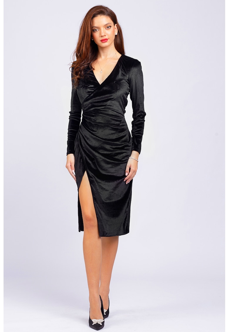 Rochie de ocazie neagră midi din material sintetic cu slit lateral – Reducere 67.96 %