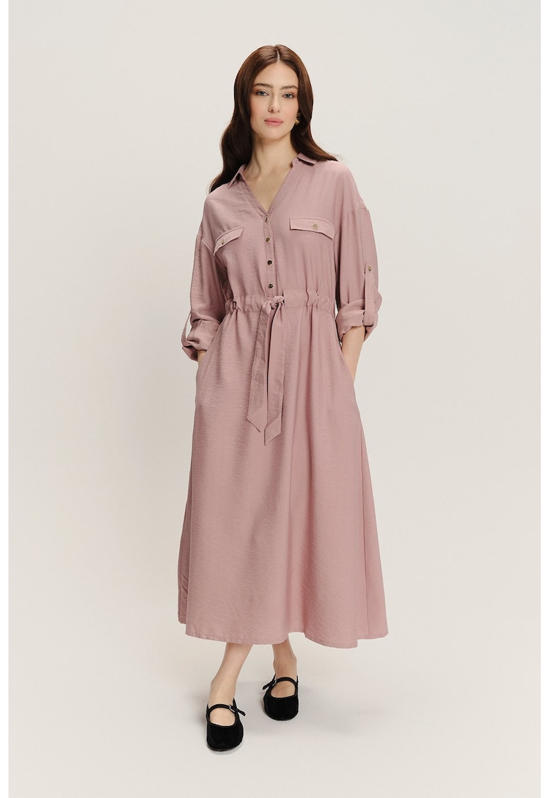 Rochie cu talie ajustabila si maneci lungi – Roz prafuit