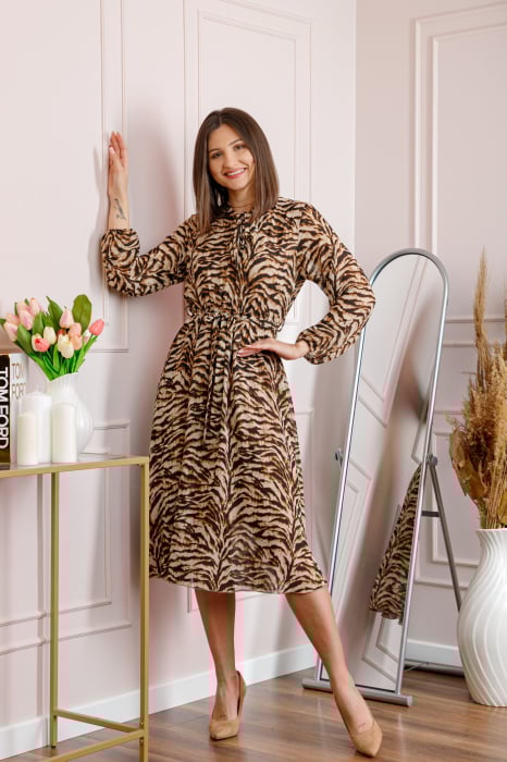 O alegere ideală pentru evenimente: rochia din voal bej cu animal print. Rafinament și confort remarcabil.