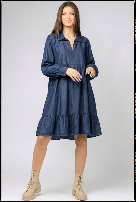 Rochie dama denim cu guler si croi lejer cu volane din bumbac