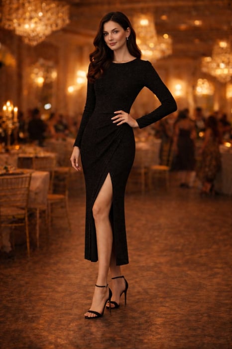 Când fiecare detaliu contează, această rochie neagră cu sclipici devine alegerea ideală pentru a străluci la evenimentele speciale. Croiala lungă îmbrățișează silueta feminină, subliniind formele într-un mod elegant, în timp ce slit-ul lateral adaugă o notă îndrăzneață. Mânecele lungi și gulerul discret conferă un aer sofisticat, perfect pentru serile de gală sau întâlnirile festive.