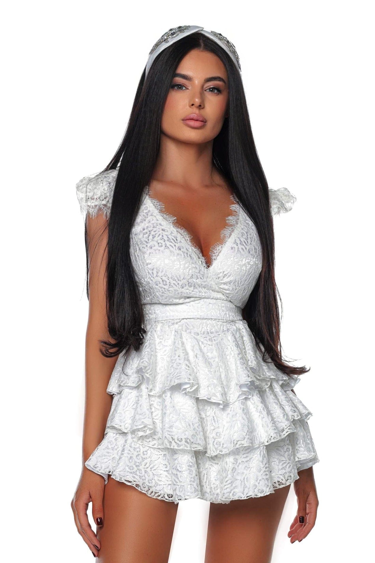 Rochia din dantelă cu volane îmbină delicatețea materialului cu un design jucăuș, perfect pentru o apariție memorabilă. Croiul baby-doll și decolteul în V pun în evidență talia și silueta, făcându-te să te simți elegantă și plină de încredere. Această rochie este ideală pentru evenimente speciale, oferind un aer romantic și rafinat.