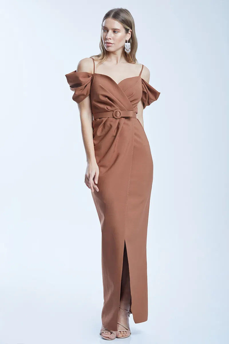 Rochie de dama eleganta lunga, maro, cu umerii goi, Sophie