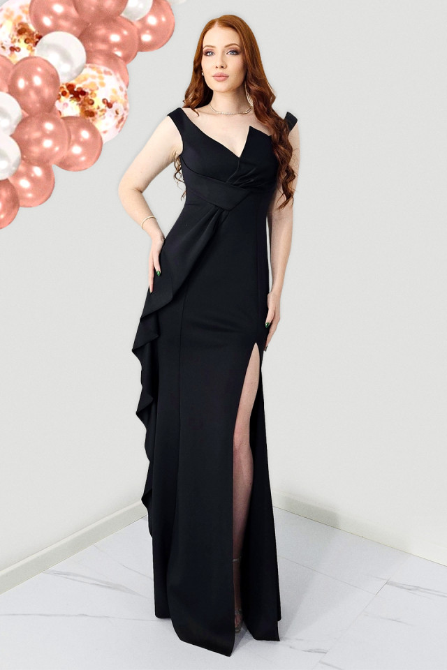 Rochie de ocazie Zahea, cu crăpătură amplă si fantă asimetrica tip fundă, Negru