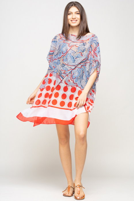 Rochie de plaja tip poncho cu motive florale si buline rosii, vascoza