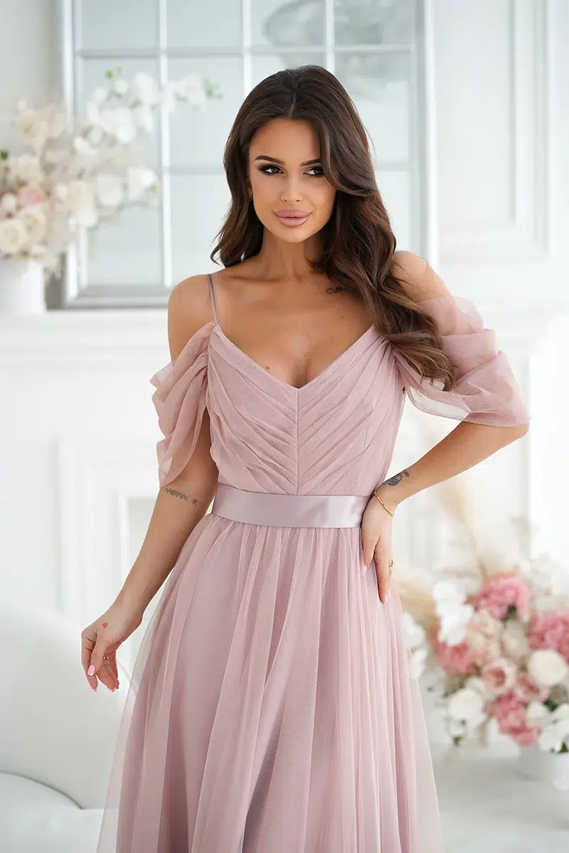 Rochie elegantă din tul cu decolteu în V și umeri căzuți – Reducere 19.87 %