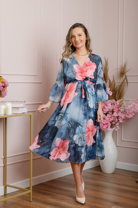 Rochie elegantă bleumarin din voal cu imprimeuri florale – Reducere 27.62 %