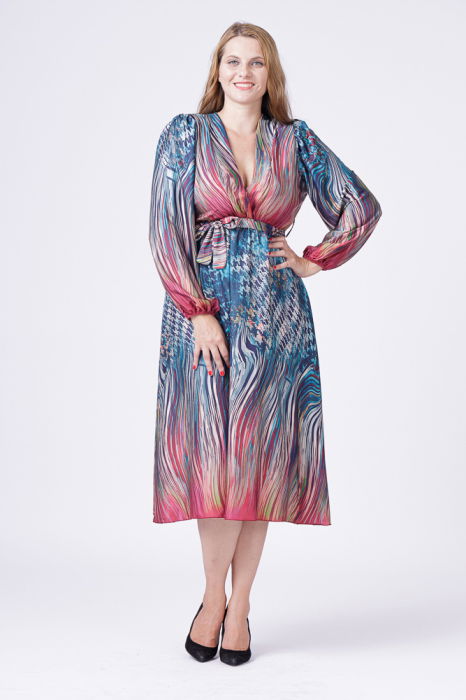 Rochia elegantă cu bust petrecut și imprimeu predominant turcoaz este alegerea ideală pentru o femeie modernă care își dorește să strălucească. Cu un croi lung și fluid, această piesă vestimentară se evidențiază prin detalii rafinate, precum manecile lungi cu elastic la încheieturi, care adaugă un plus de stil.