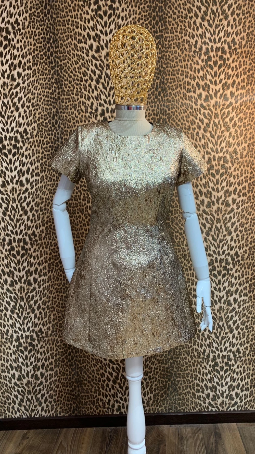 Rochie elegantă din brocard aurie cu croi cambrat și mâneci scurte – Reducere 20 %