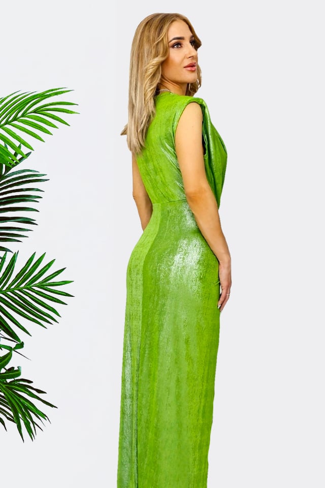 Rochia care atrage toate privirile: metalizat verde deschis. Eleganță și confort remarcabil. Ideală pentru ocazii speciale.