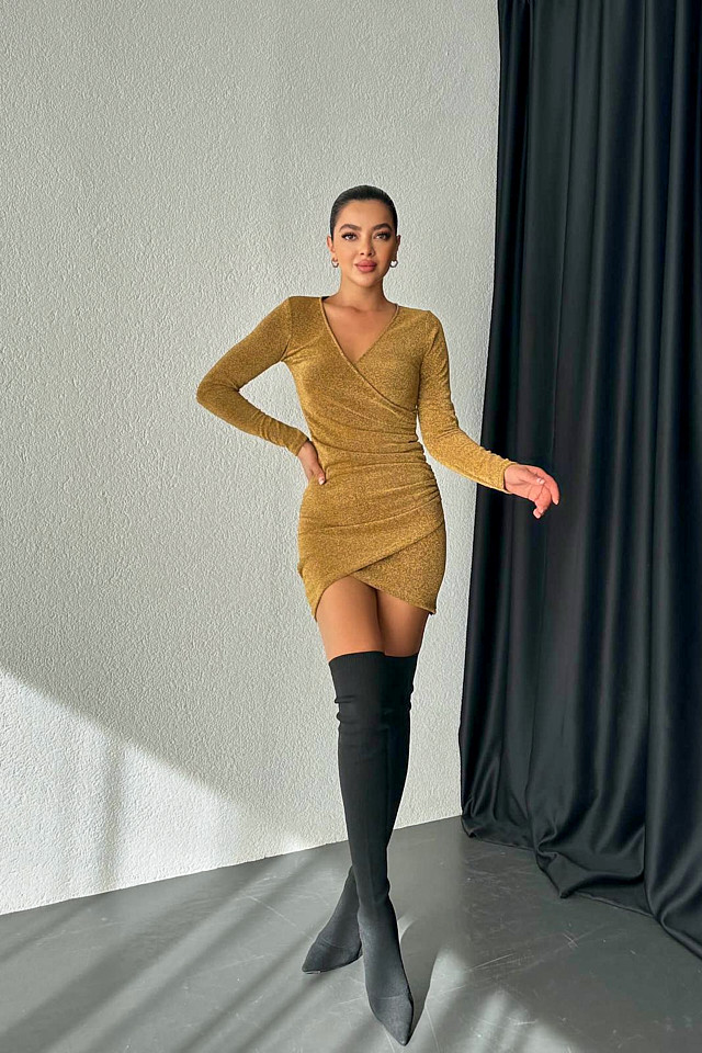 Nou în colecție: rochie bodycon auriu cu fronseuri. Perfectă pentru ocazii speciale.