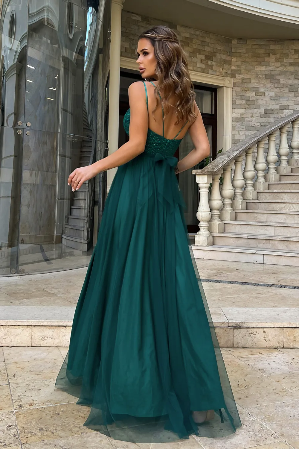 Oferă-ți un look deosebit cu această rochie elegantă lungă, care îmbină perfect rafinamentul cu un strop de fantezie. Construită cu o fustă din tull ce adaugă volum și mișcare, această rochie prezintă un decolteu în V elegant, îmbrăcat cu dantelă fină, ce accentuează delicatețea siluetei tale.