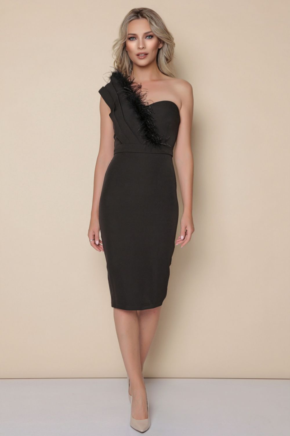 Rochie elegantă neagră conică din material elastic cu pene – Reducere 30 %