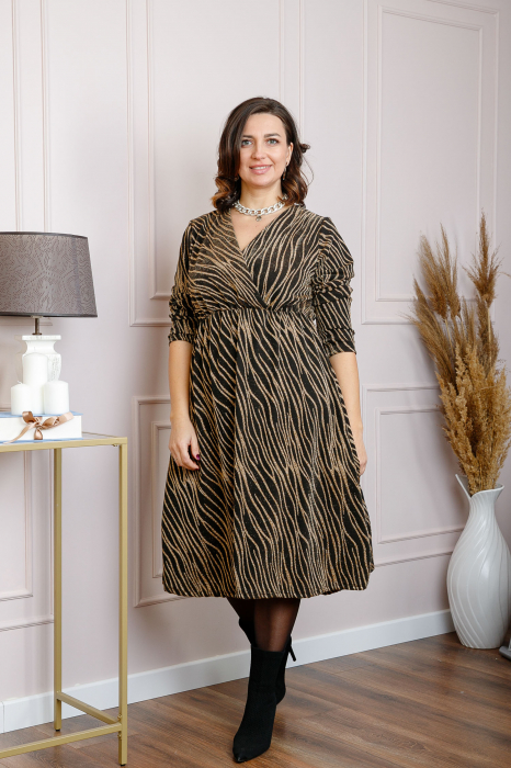 Rochie elegantă auriu din material confortabil cu imprimeu – Reducere 33.2 %