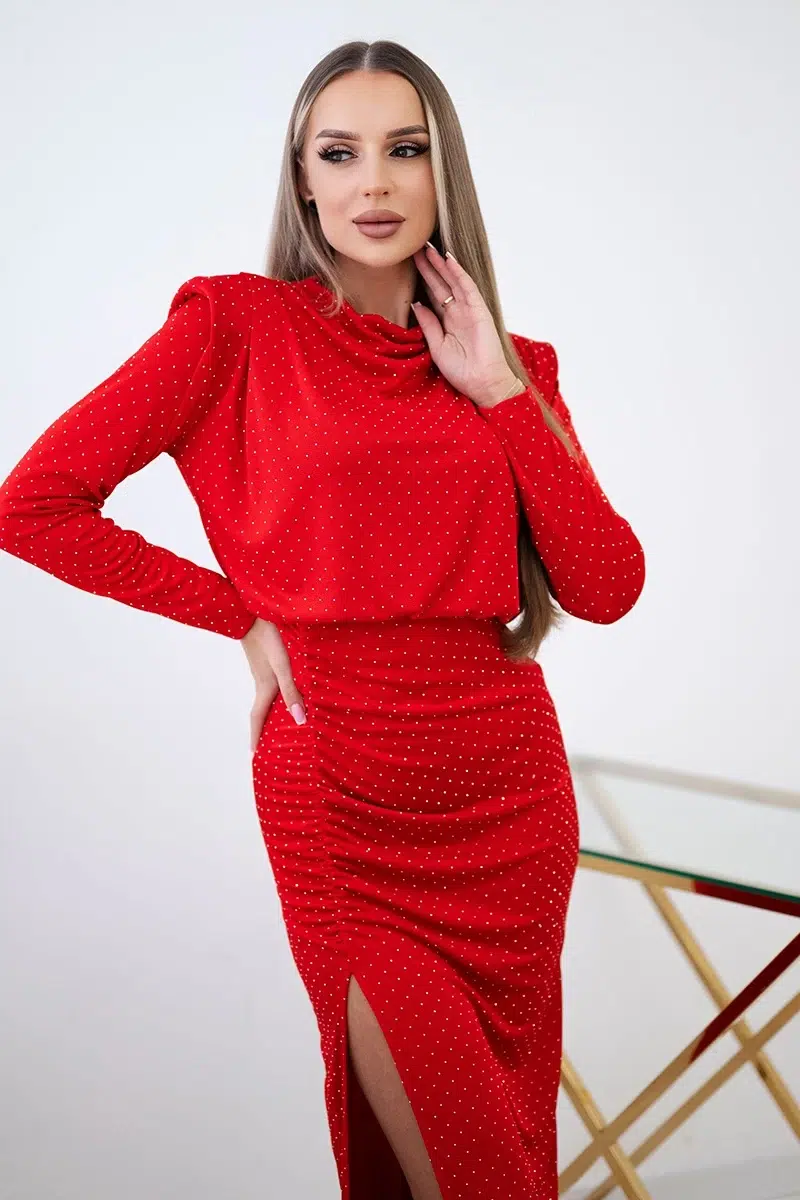 Rochie elegantă roșie cu buline și despicătură laterală – Reducere 60.23 %