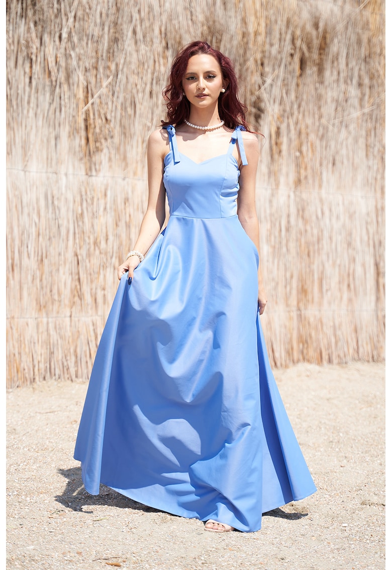 Fii în centrul atenției cu rochia evazată Antonia, într-o nuanță delicată de albastru deschis. Această rochie lungă este perfectă pentru ocaziile speciale, oferind un aer elegant și rafinat.