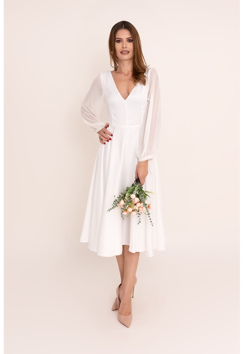 Rochie elegantă albă din poliester cu decolteu în V – Reducere 50 %