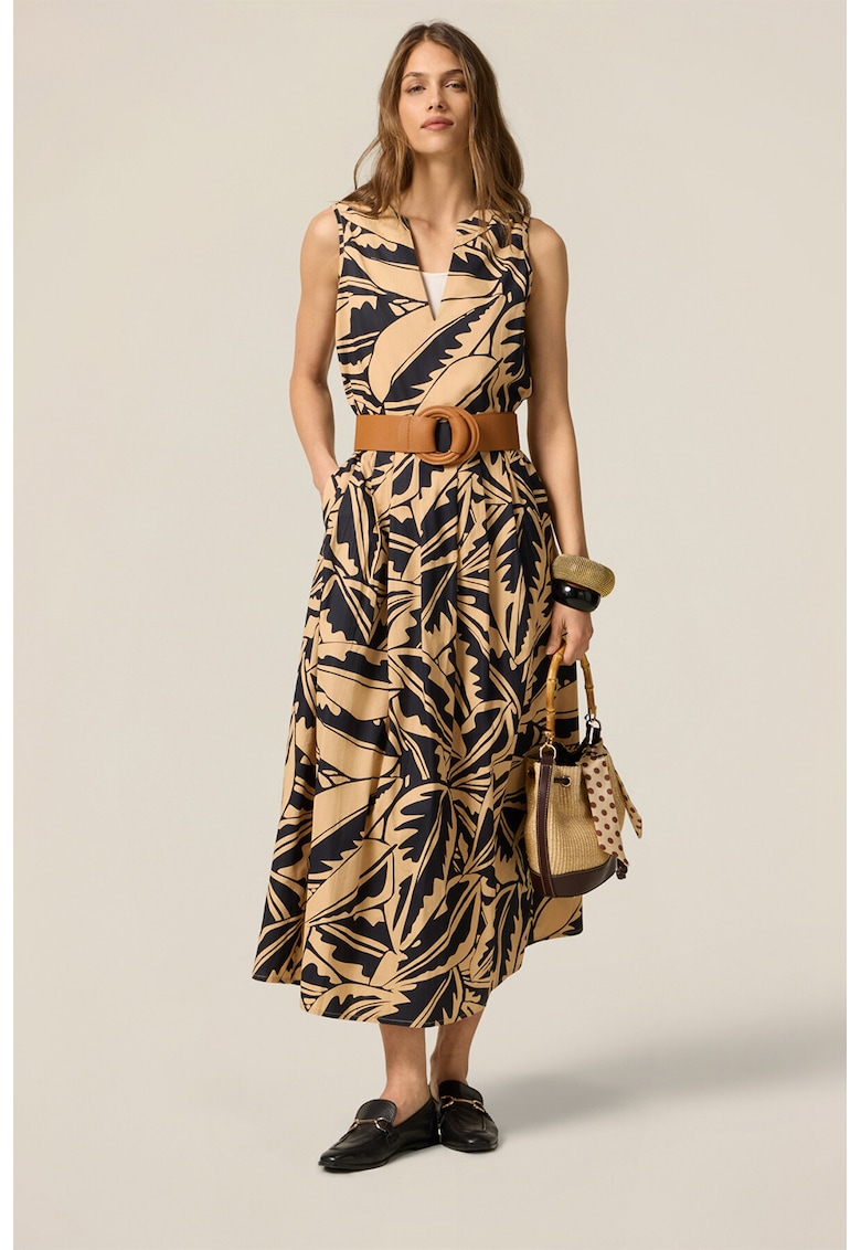 Croiul evazat asigură o cădere lejeră, ideală pentru o siluetă feminină, iar lungimea midi o face perfectă pentru o varietate de ocazii, de la plimbări în parc la brunch-uri cu prietenii. Rochia are un decolteu în V care îți va evidenția gâtul și umerii, oferind un look sofisticat, dar relaxat. Fără mâneci, această rochie îți permite să te bucuri de soare, în timp ce imprimeul grafic adaugă o notă modernă ținutei tale.