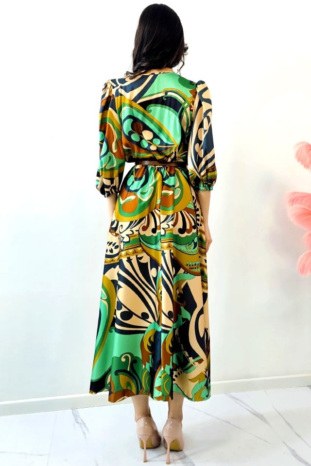 Rochie evazata LORY, cu imprimeu Africa si curea metalica, Verde