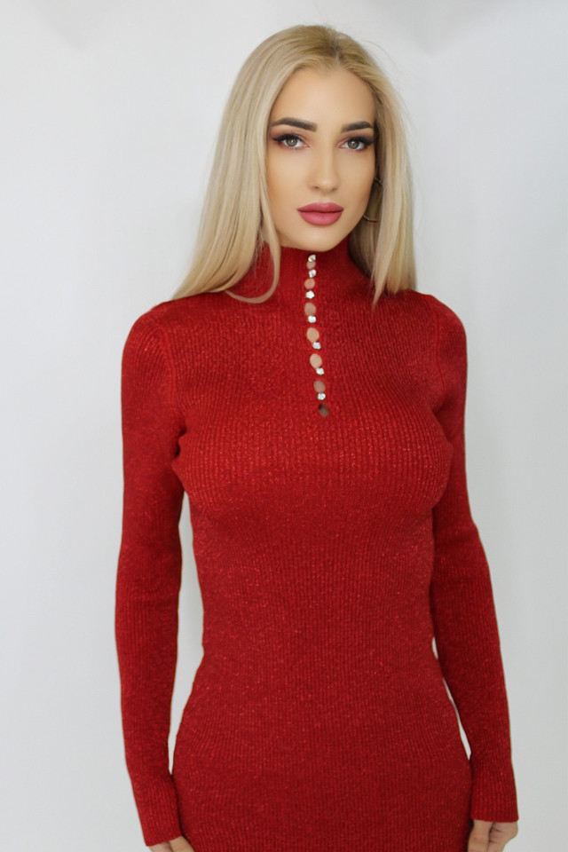 Rochie elegantă roșie midi din polyester cu guler pe gât și aplicații metalice