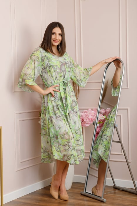 Rochie Grace din voal cu croi in A si imprimeu floral verde lime