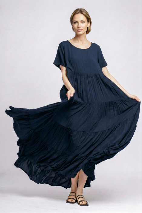 Rochia lungă bleumarin, cu un croi amplu și patru volane, emana un aer boem elegant, perfect pentru femeia modernă care își dorește confort și stil. Aceasta rochie are maneci scurte și un decolteu rotund, oferind o notă de rafinament.