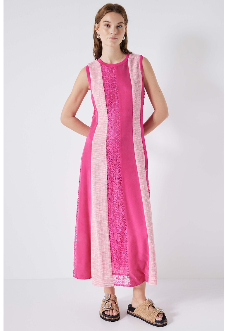 O alegere ideală pentru vară: rochia lungă fucsia, cu imprimeu în dungi. Perfectă pentru un look casual și confortabil.