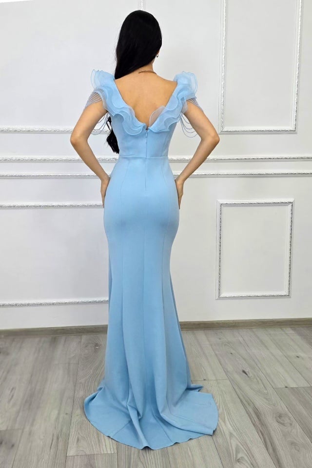 Rochie lunga cu trena Zenaria, cristale si crapatura pe picior, Baby BLUE