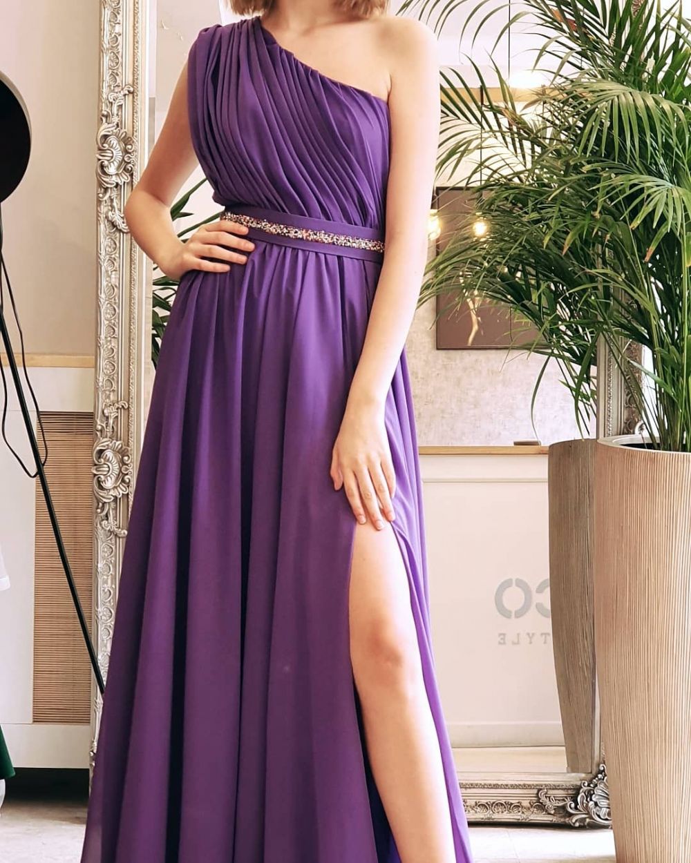 Poartă cu încredere rochia din voal mov. Rafinament și confort garantat pentru evenimente deosebite.