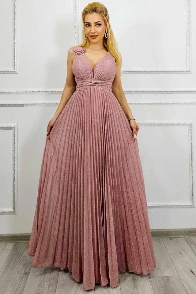 Rochie lungă de seară roz din georgette cu detalii florale – Reducere 9.86 %