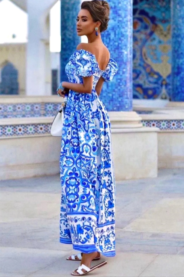 Imprimeul floral regal îmbină nuanțe de albastru vibrat cu un fundal delicat, asigurând o apariție deosebită la orice eveniment casual sau plimbare de vară. Mânecile bufante adaugă un plus de volum și dramatism, accentuând silueta și oferind un aspect de poveste. Confortul este garantat prin materialul ușor, ideal pentru zilele călduroase, și croiala lungă cu pliuri ce asigură o mișcare liberă.