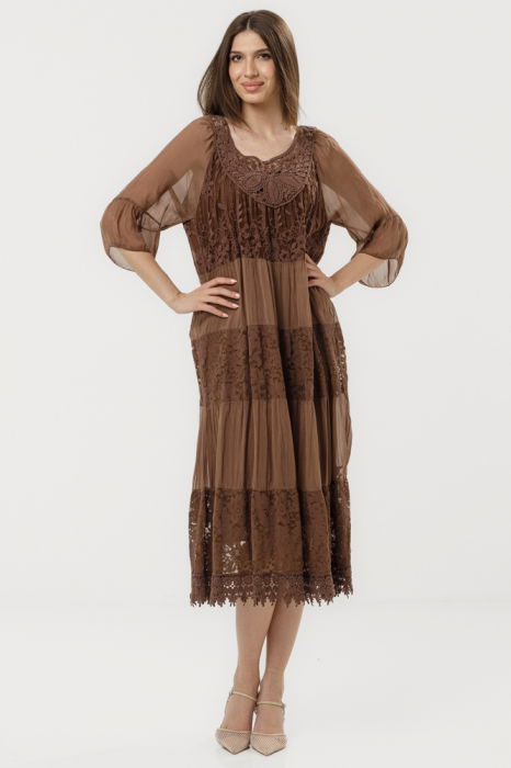 Rochie lunga din matase si vascoza cu detalii din dantela, maro
