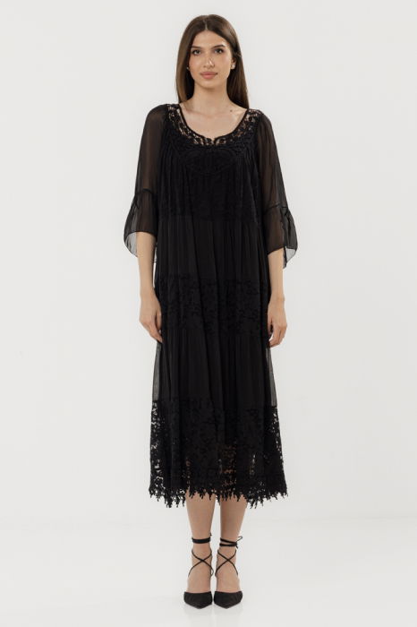 Rochie elegantă neagră din mătase și vâscoză cu dantelă